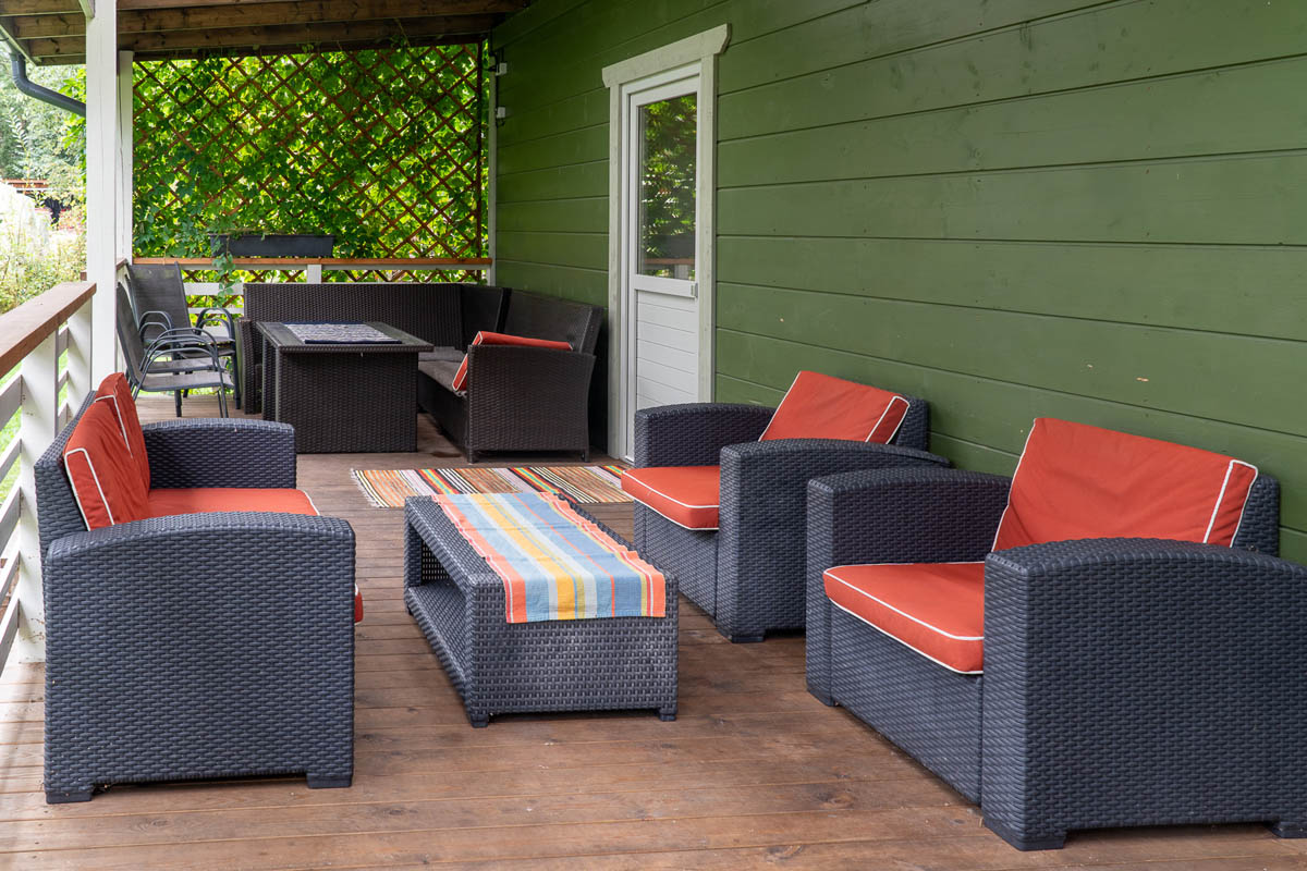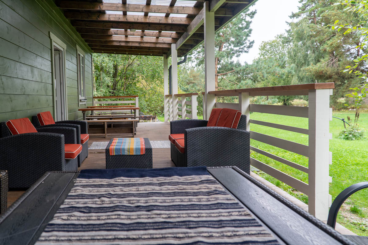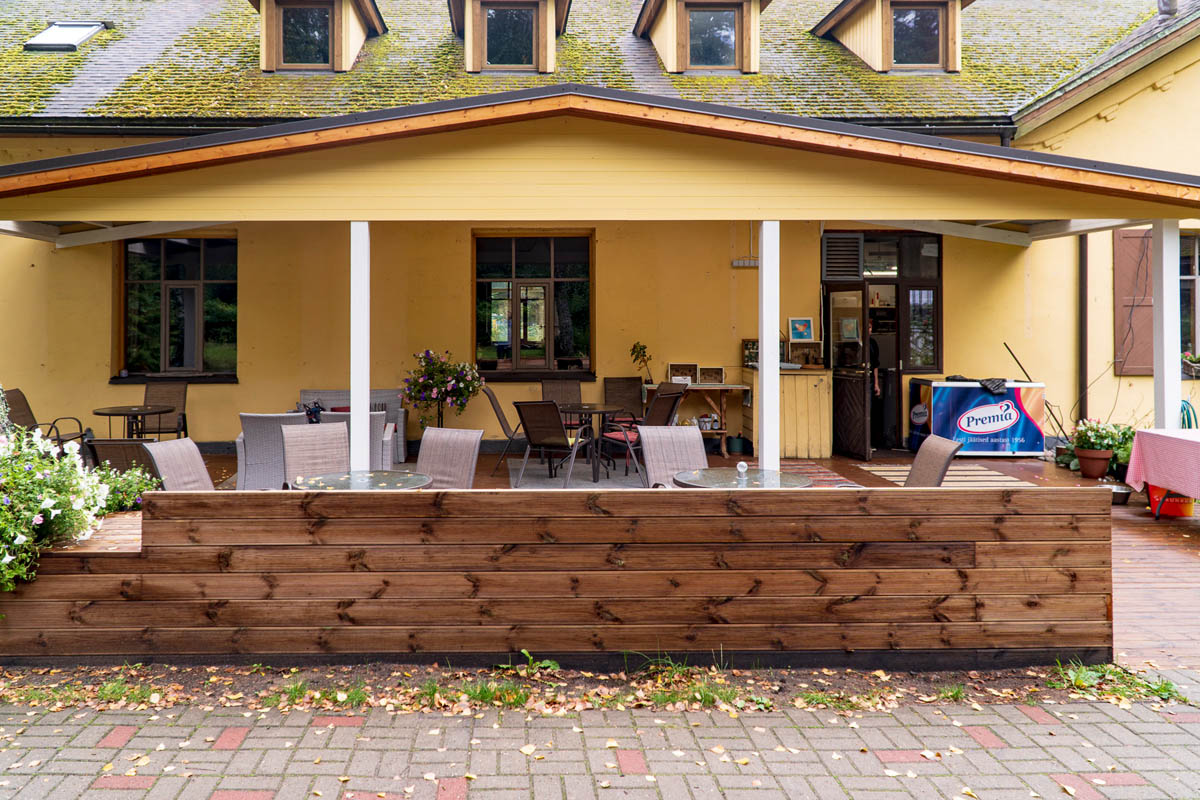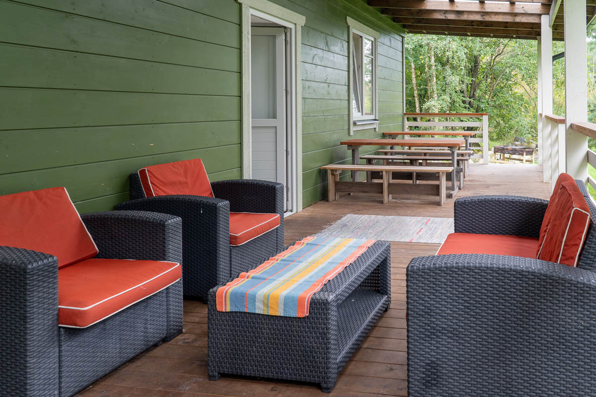 Talon takana on tilava terassi istuimilla ja pöydillä, ihanteellinen paikka nauttia luonnon kauneudesta ja raikkaasta ilmasta saunan jälkeen. Tule kokemaan, kuinka saunamme auttavat sinua löytämään rauhan ja tasapainon.